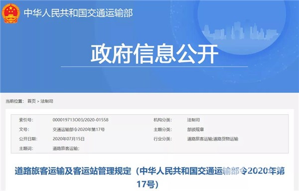 2020年7月15日,交通运输部发布了《道路旅客运输及客运站管理规定(中华人民共和国交通运输部令2020年第17号)》。